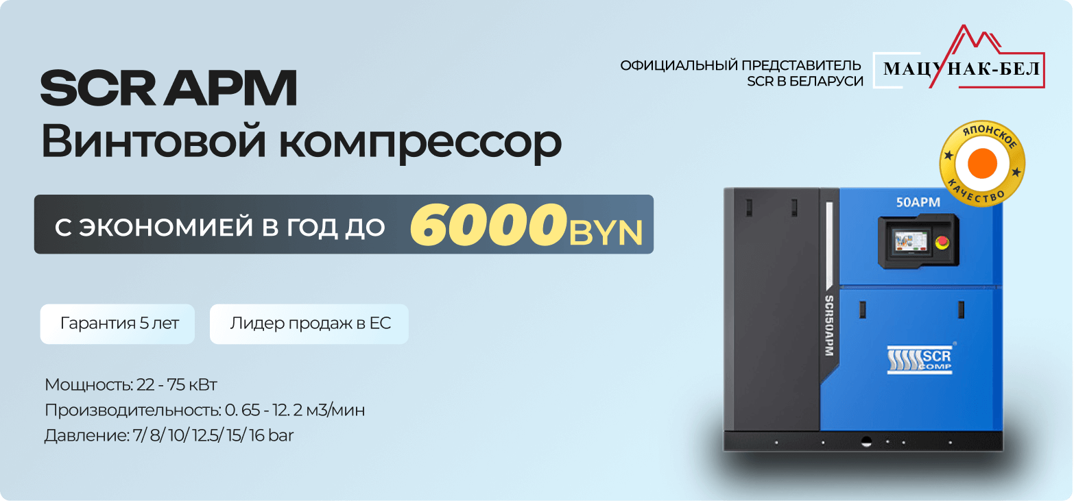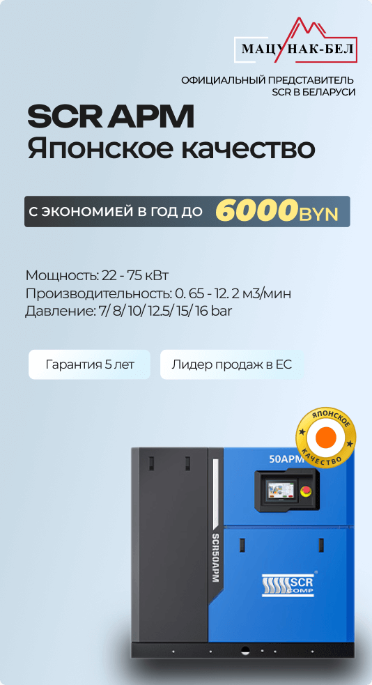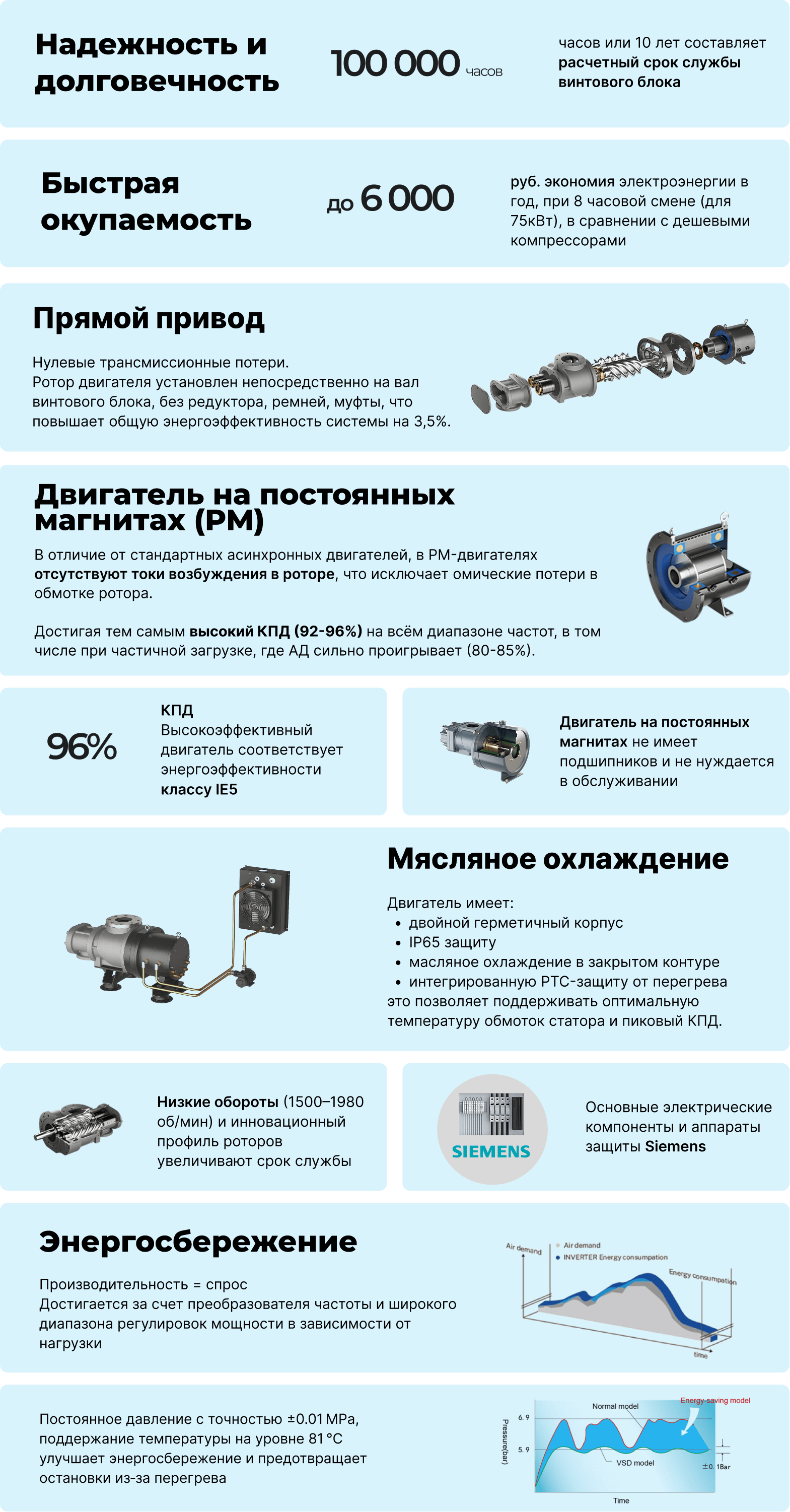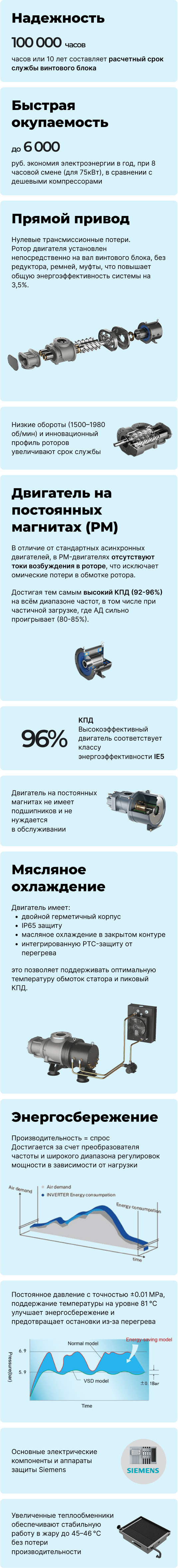 Винтовой блок :Новый улучшенный профиль ротора; R&D Совместно с Японией; Рассчитан на 10 лет надежной работы