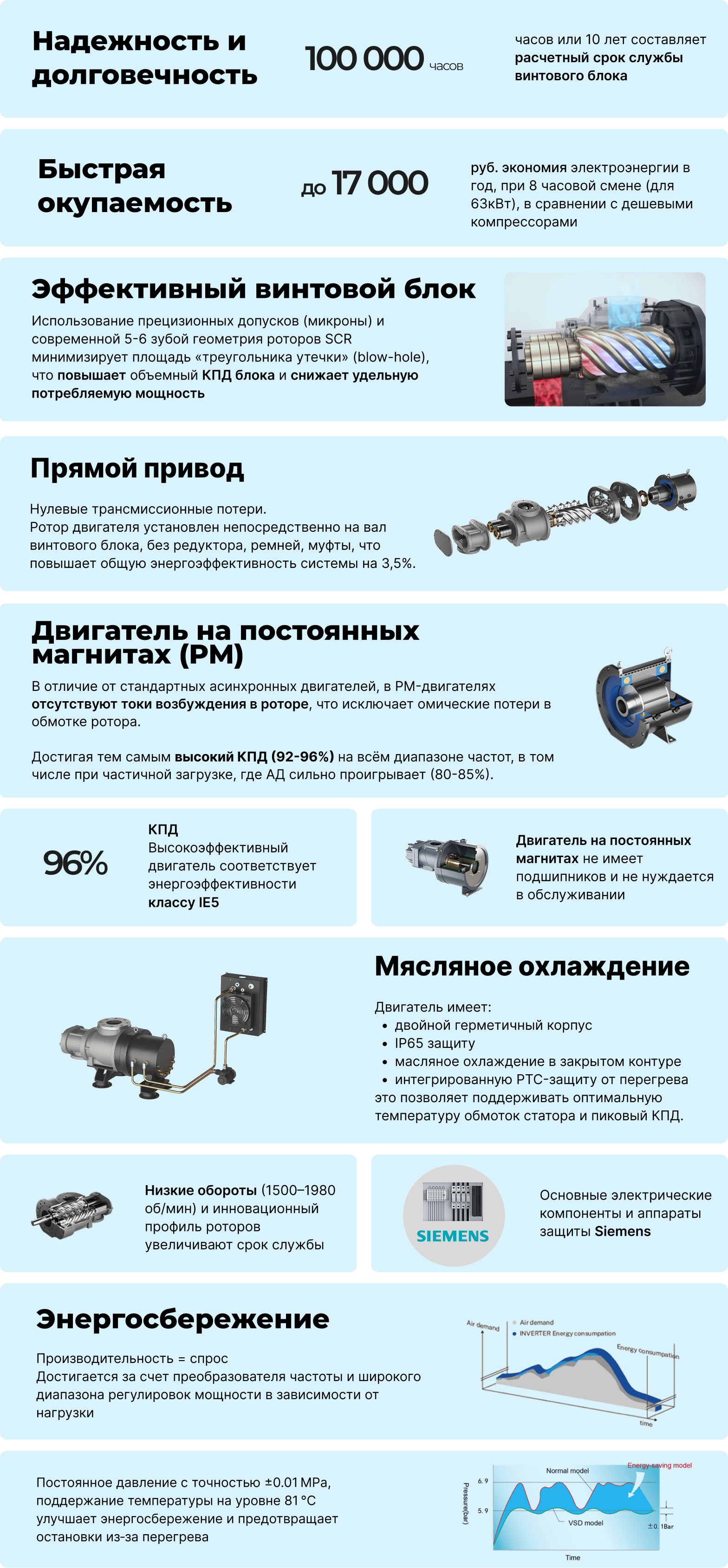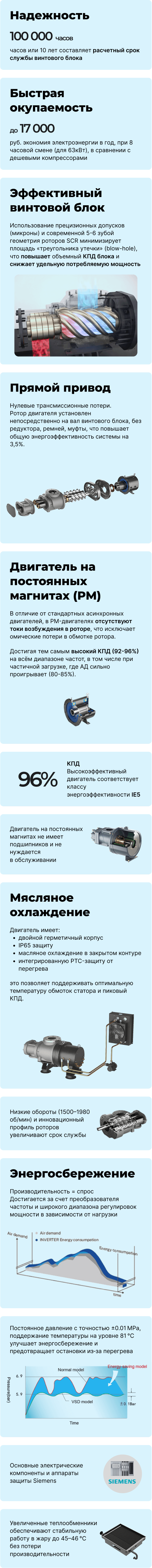 Винтовой блок :Новый улучшенный профиль ротора; R&D Совместно с Японией; Рассчитан на 10 лет надежной работы