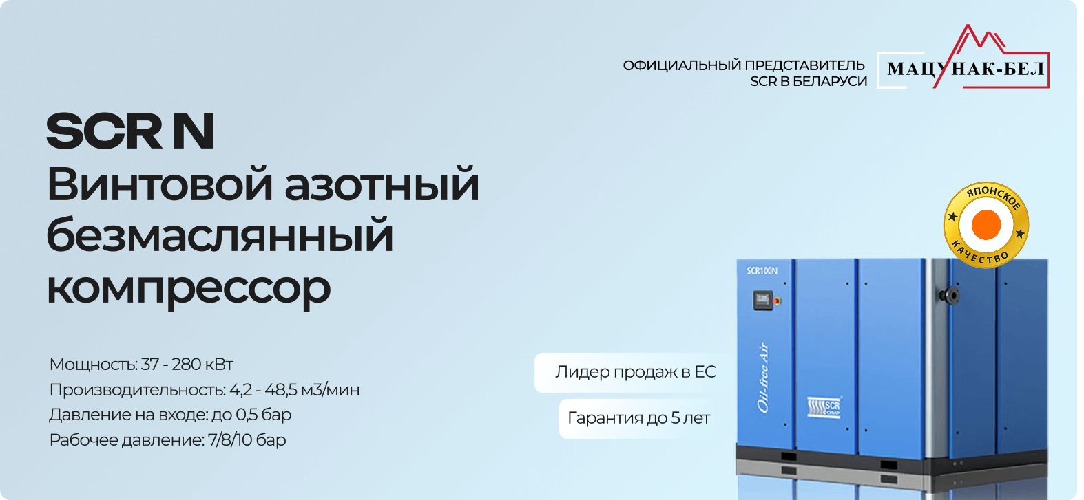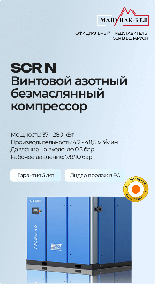 Винтовые компрессоры SCR серии N разработаны специально для высокоэффективного сжатия азота. Оборудование обеспечивает 100% безмасляное сжатие газа до рабочего давления 7, 8 или 10 бар, сохраняя его абсолютную химическую чистоту и предотвращая любые загрязнения.